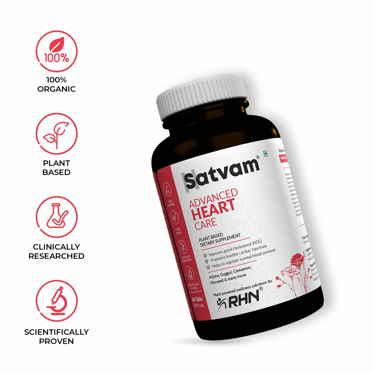 Satvam’s Advanced heart care offers a plant-based formulation that contains key ingredients like Arjuna, Guggul, Cinnamon, and Flaxseed. These ingredients aid in enhancing healthy cardiac function by improving heart muscle strength, regulating normal blood pressure, and helping in lowering bad cholesterol levels (LDL).