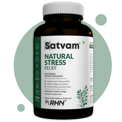 Satvam’s Natural Stress Relief product is a plant-based formulation that contains key ingredients like shankhpushpi, valerian, brahmi, and ginseng. These ingredients manage stress and anxiety by stabilizing the hormones and improving blood circulation to the brain. Additionally, improves mental focus and attention.