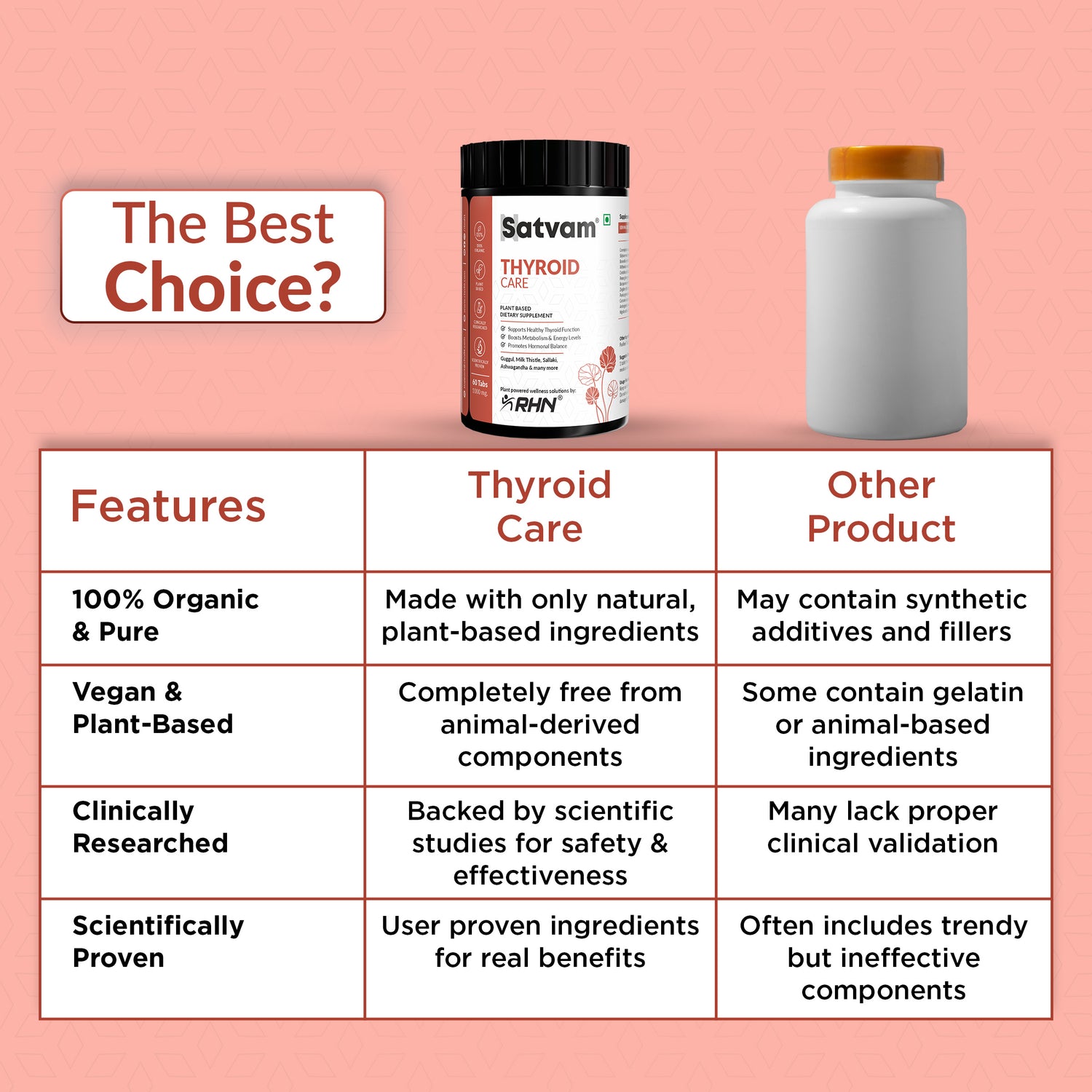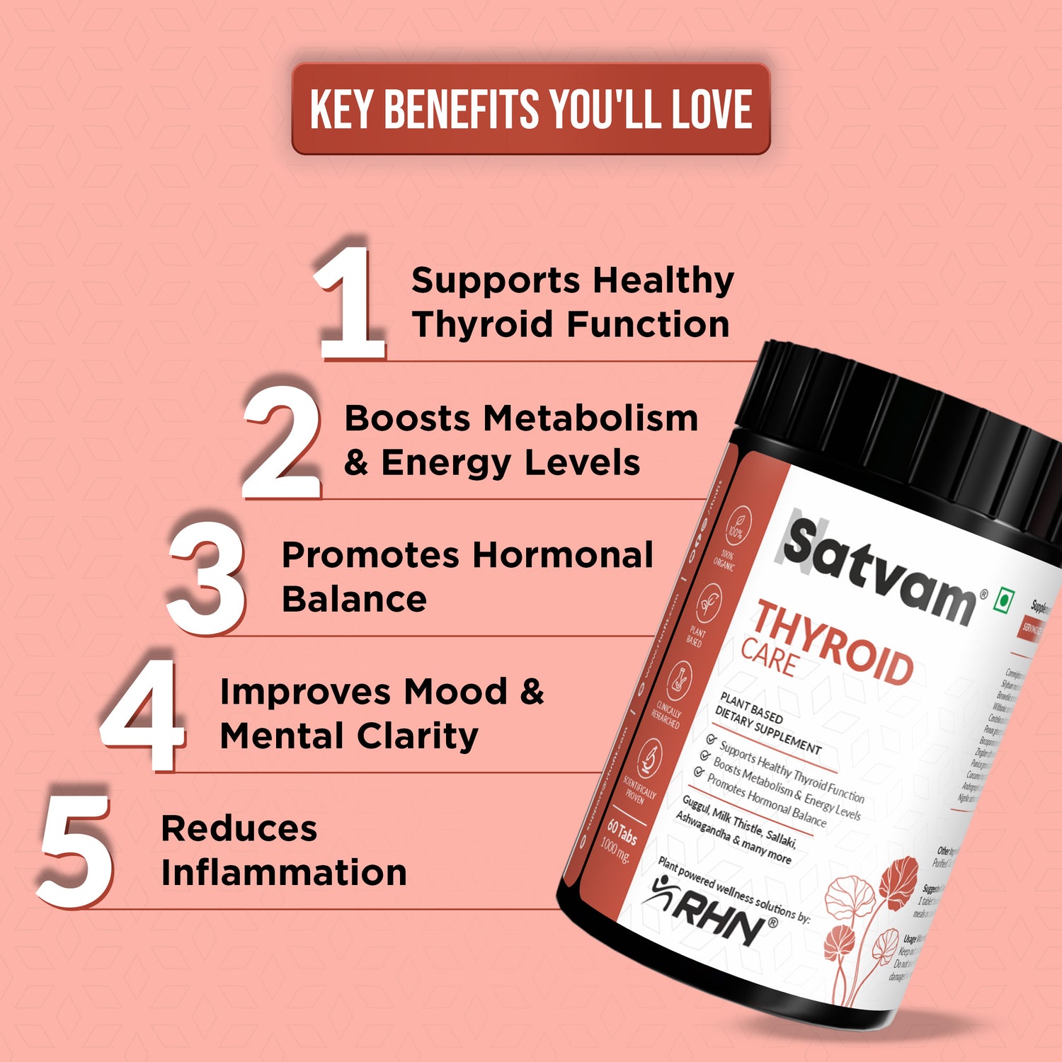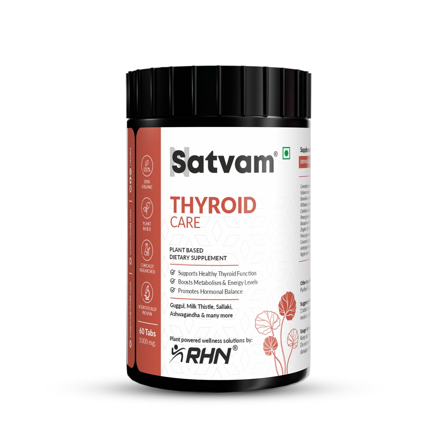 Satvam’s Thyroid Care offers a plant-based formulation that contains key ingredients like Guggul, Milk Thistle, Sallaki, and Ashwagandha.